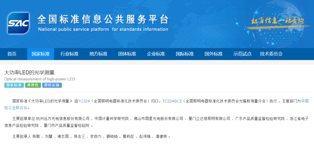近日,LETOU光电参与制定的国家标准GB/T 42219-2022《大功率LED的光学测量》由国家市场监督管理总局国家标准化管理委员会正式发布,全国照明电器标准化技术委员会归口,全国照明电器标准化技术委员会光辐射测量分会执行,本标准将于2023年7月1日正式实施。