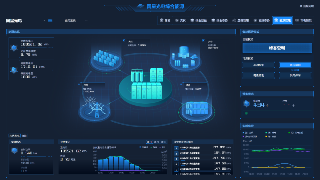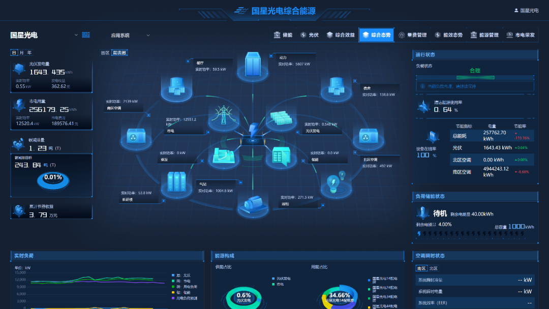 综合能源管理平台融合多能互补、用能服务、智能运维、售电及需求侧响应四个模块,实现每个模块“一图读懂”,能源数据一目了然;通过对接光伏、储能、空压机及中央空调等能源系统,及时准确掌握“电、冷、气”等关键能源要素的整体情况,平台可实现能源管控从“粗放管理”向“精细管控”的提升;通过开展“能源综合要素及碳排放数据”双维度统计分析,平台可实现实时监测、动态跟踪、量化分析、趋势分析、流程追溯、预警报警等能源全过程的闭环管理。