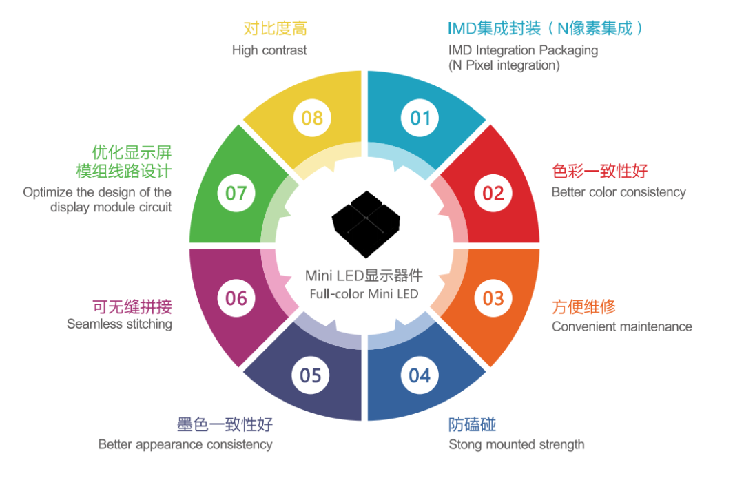 LETOU光电作为LED显示封装行业主推IMD封装技术的企业,于2018年率先推出IMD-M09T,实力开启P0.X显示新时代。IMD封装设备80%以上兼容,产业供应链(芯片、基板、线材)、设备配套成熟,因此,屏厂可快速切入,加快超高清显示商业化进程。目前,RGB器件事业部已成功推出基于IMD封装方案的P0.9-P0.4的全系列Mini LED产品,具有高性价比、影院级色域、可规模量产、高密度封装等特点,可满足从81寸到162寸4K/8K终端显示设备的需求。凭借出色的性能和丰富的方案选择,该系列产品已得到了市场的广泛认可。